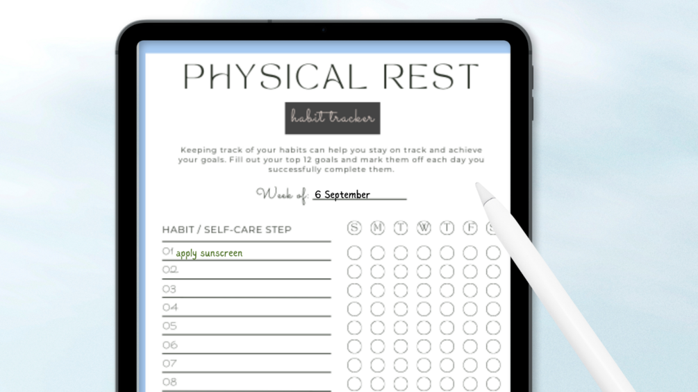 Stay on top of your mental health with this helpful digital tracker. Track seven types of rest and self-care habits to stay mentally balanced and healthy. The simple format makes it easy to use on your iPad. Care for your mental well-being today!